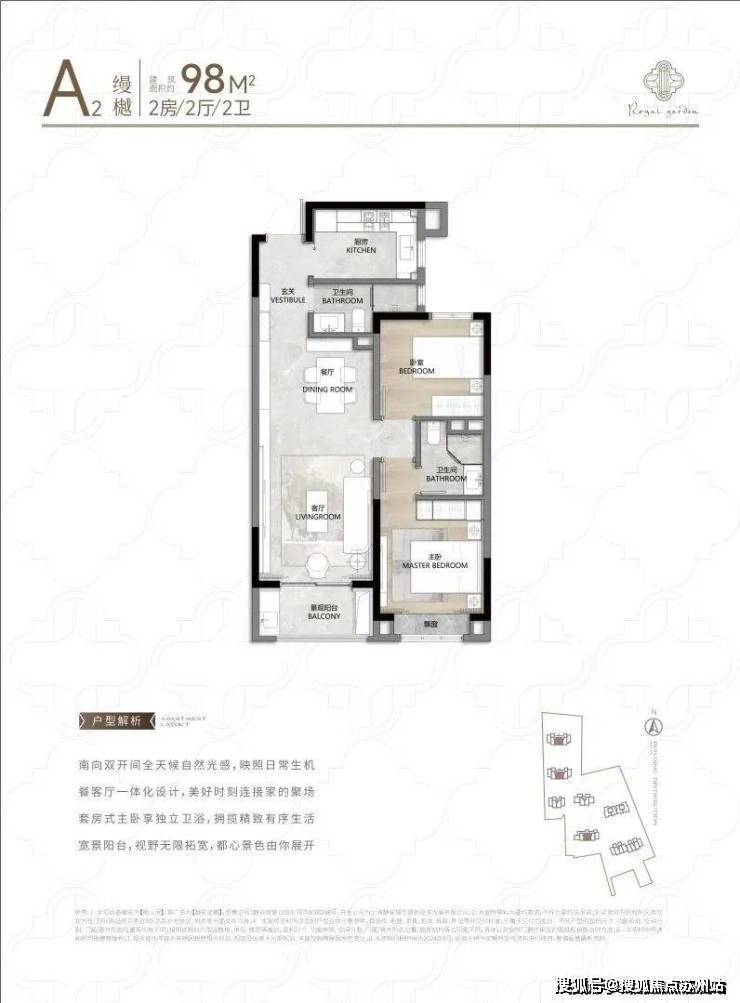 全明卫生间干湿分区、通风防潮。这套104㎡的3房2厅2卫,南北通透,户型方正,合理规划功能布局,追求品质人群优先好选择。