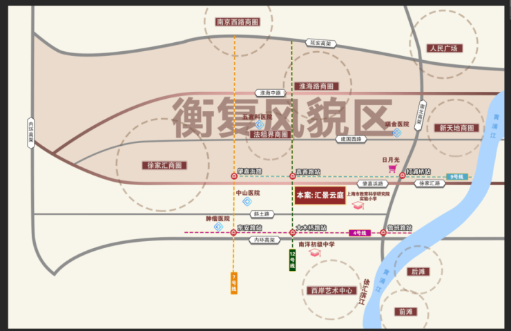 汇景云庭紧挨着徐汇区复历史风貌区,即景泰大厦坐落于斜土路1175号,步行500米就可以到达9号线和12号线嘉善路站,2站可达徐家汇商圈、南京西路商圈。距离地铁4号线约800米、13号线约1.5公里,内环内得天独厚的地理位置。毋庸置疑这样的地段享受的必然也是城市塔尖级的高能配套。