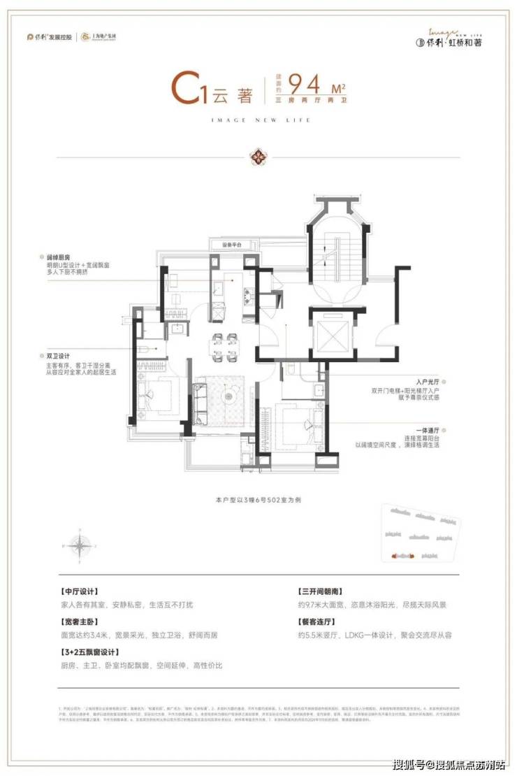 阳光梯厅入户、朝南三开间,铺就尊崇仪式感;U型厨房直连餐客连厅,款待客人相聚尽显从容;3+2五飘窗设计,会客休憩时有轻风相伴。