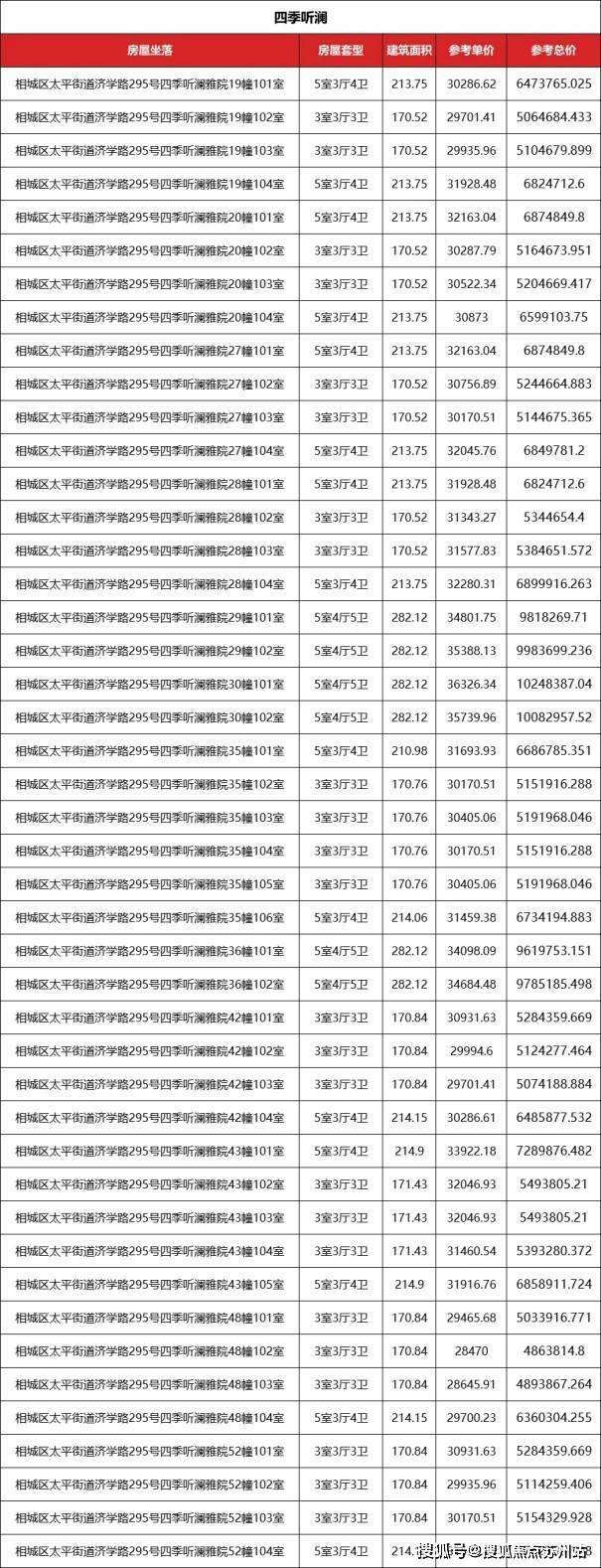 在这里,你可以找到多种类型的住宅:6栋3层的合院、35栋3层的联排、13栋4层的叠加以及12栋7层的洋房。户型面积从127平方米的洋房到280平方米的联排,能够满足不同家庭的需求。值得一提的是,四季听澜的楼面价为11500元/平方米,备案均价为31725元/平方米,具体价格可根据一房一价表了解。