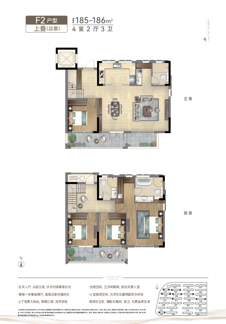 新亚洲洋房采用坡屋顶、深挑檐,描摹中式建筑神韵;大面落地窗,蓝灰色LOW-E玻璃,让阳光照进每一寸空间;内敛的建筑气质、沉稳的质感、舒适至上的空间,营造融于湖光天地的美好温度。