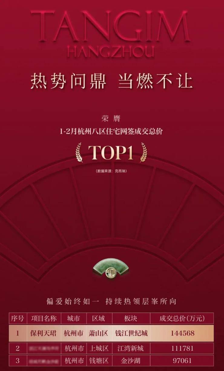 1-2月份,保利天珺是全杭网签金额TOP1(数据来源:克而瑞),至今还未看到对手,很可能在整整一季度,它都是王者!