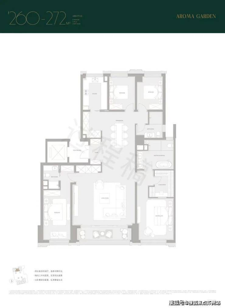建面约260/272㎡,南向双套房,尤其主卧是豪华套房,带独立衣帽间,卫浴间含双台盆+淋浴+浴缸+马桶四件套。