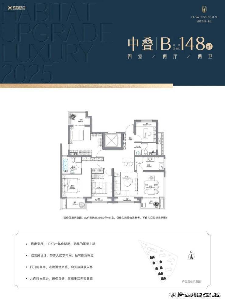 本宣传资料所涉及的户型仅供示意参考。仅为横拟本户型装修效果叠加装修设想进行展示、所示室内装修、家具、陈设、灯具、门窗等除注明外均不在交房范围之中;相同户型因楼栋楼展、单元等差别,局部结构、面积、功能布局、空间分制、门窗/管井形态位置等可能有不同,并且强弱电箱、插座位置等均未在户型围中体现,具体以政府部门及终审定的图纸和《商品房买卖合同》为准,本广告制作日期为2025年5月20日,有效期至2025年6月20日。开发商:上海招宜置业有限公司,推广名:招商臻境。