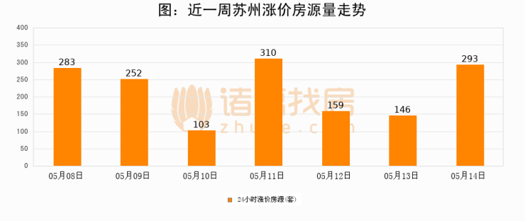 根据诸葛找房数据显示,苏州24小时涨价房源量为293套,较05月13日增加147套,环比上涨100.7%。与此同时,涨价房源占比小幅扩大,业主信心有所提升。