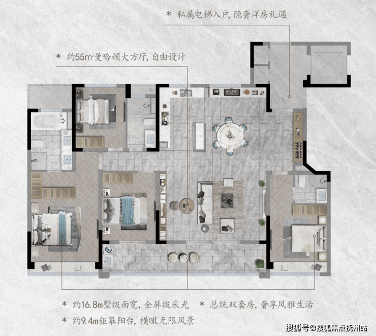 更有总统双套房设计,立体式地向嘉兴重新诠释了改善阔居的标准。这一席建面约179㎡,不仅代表着物理层面上的舒适感,还代表着居者精神层面上的宽境气魄。