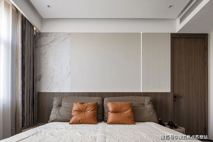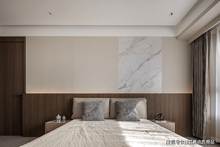 主卧背景墙层次丰富,木饰面护墙板温暖围裹睡眠区,骨格线勾勒出质感,白色岩板点缀给人足够的安全感,整体细腻的质地视觉可见。
