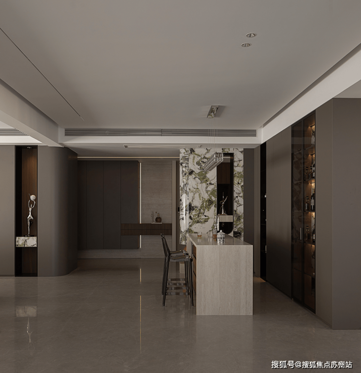 入户玄关,应用了翡翠绿岩板热弯工艺,低奢材质的选择,打造时尚优雅的宜居之境,使空间散发浪漫气息,成为空间的点睛之笔。