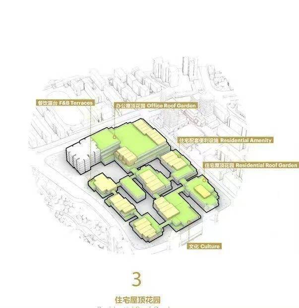 归家动线: 建立在混合业态的基础上,住宅用户归家,可以通过专属独立大堂的艺术阶梯或者周边电梯,垂直抵达三层/四层归家花园道,实现情绪归家。在花园内可以通过风雨连廊实现无风雨归家。