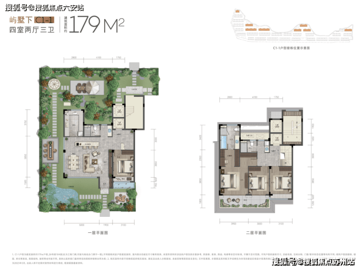 下叠:270°环抱花园(60-100㎡)+下沉庭院,L型半包围客餐厅(约7.2米面宽),独立老人房;
