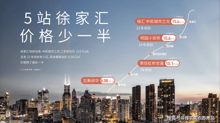 5站可达徐家汇,徐家汇二手次新房均价达15.6万/㎡,5站地铁价格几乎减半,性价比优势极为突出。