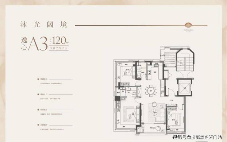 户型特点:边套户型,3开间朝南,方正格局.客餐厅一体化设计,餐厅空间宽敞,客厅进深较短但可通过与阳台连通优化空间感.全屋飘窗设计,边套南北卧室为270°转角飘窗,采光充足.独立电梯厅约7-8㎡,可改造为玄关或收纳空间.