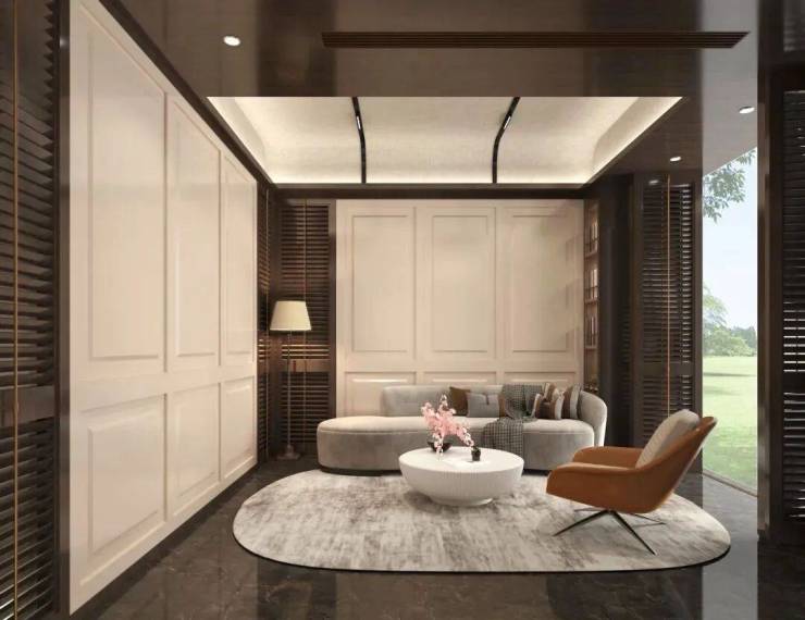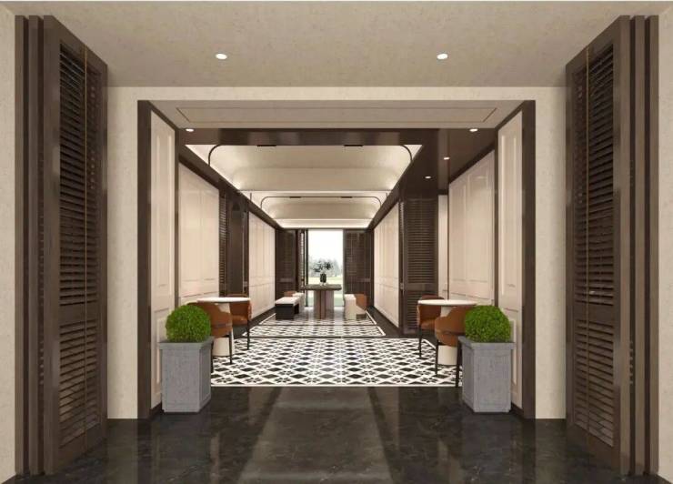 3、5#下面的架空层打造艺术长廊、共享区、休闲区和会客区,整体设计结合海派文化元素,演绎空间奢尚美学。同时满足居者未来在此的社交、休闲娱乐等多元生活场景。