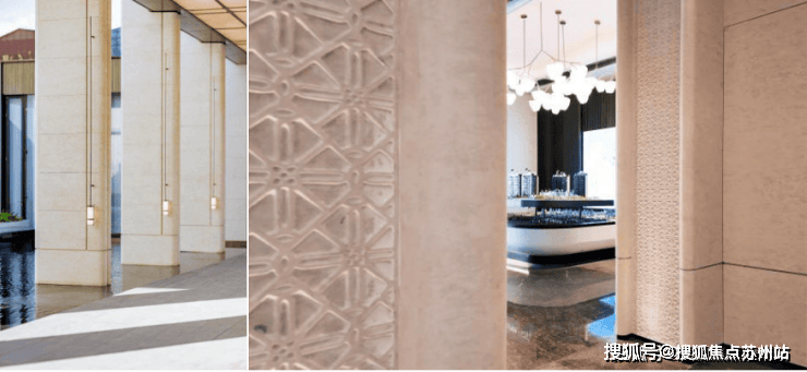 顶部定制发光云石亚克力与圆弧形的古铜色铝板交相辉映,8个西班牙宫殿沉香米黄石柱提升了尊崇感,漫步其间,揽风入怀,树影斑驳映入眼帘,水声潺潺入耳,归家的轻松感油然而生,笔者随手一拍,都非常的出圈。