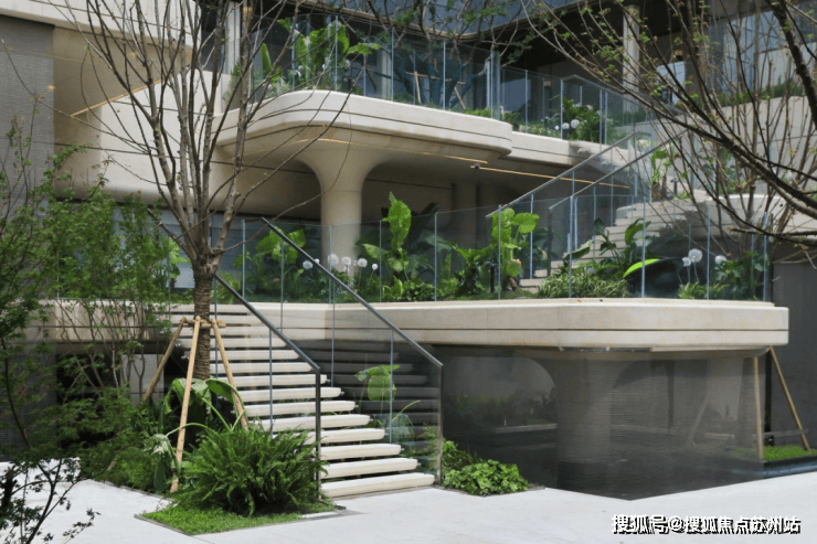 点睛之笔在于4层悬浮式阶梯,设计理念据说来自全球十二大奢华酒店之一的 迪拜丽晶公寓,每一个观景露台都种植着不同的植被,一步一景, 更重要的是,不同的露台对应着不同的观景视野点,将不同高度的下沉式庭院景观,通过极其优雅的方式传递给了业主。这个归家体验可以说是拉满了!