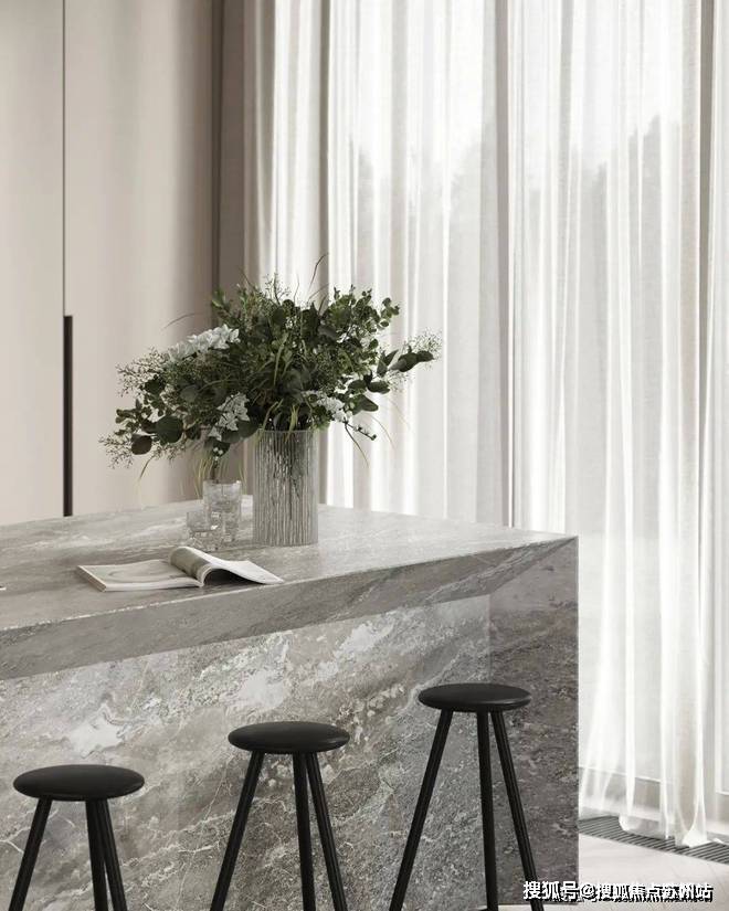 苏州上华璟庭售楼处电话☎:400-8828-814(售楼处预约看房热线)餐厅与厨房位于客厅的旁边,开放式的设计很好地利用了不大的公共空间,给人开阔的视觉感受.光线透过落地窗照入室内,让空间更加明亮.木质的圆形餐桌搭配上上方的金属吊灯,显得柔和而有质感.中岛台选用灰色大理石材质,与整体空间完美融合.