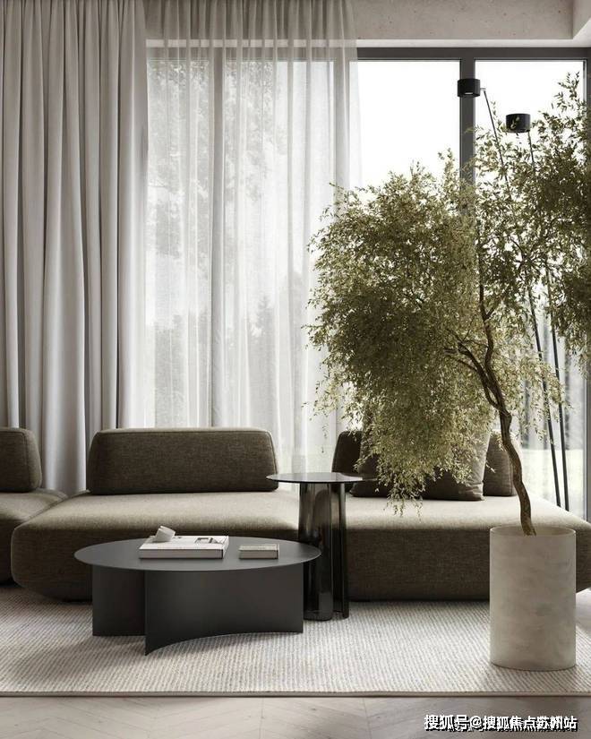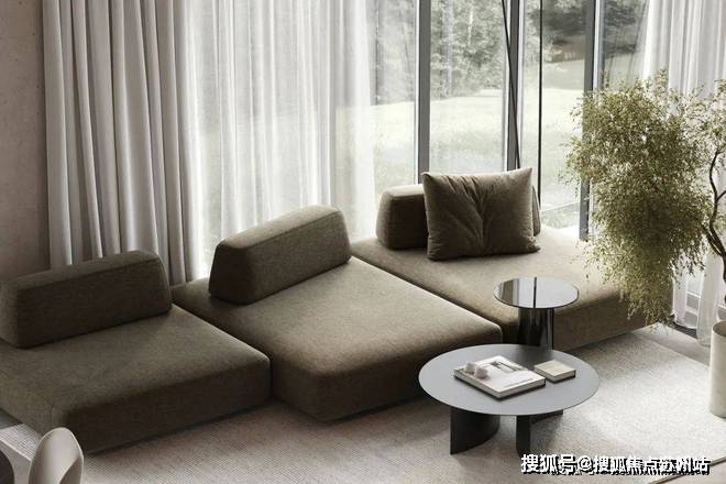 苏州上华璟庭售楼处电话☎:400-8828-814(售楼处预约看房热线)客厅中,设计师选用暖灰色作为空间的主色调,搭配上原木色的地板,奠定现代极简的空间基调.灰绿色的布艺沙发搭配上圆形的小茶几,展现出空间的几何美感.沙发旁摆放着绿植,为室内空间增添了一抹色彩,呈现出现代空间的生活美学.