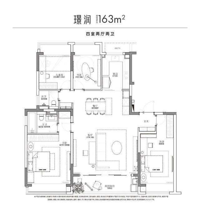 约168㎡户型:采用阔绰的横厅设计,南向面宽约13.6米,搭配近10米的大阳台,空间感十足。L型厨房、奢适主卧套房,非常适合追求空间尺度与舒适度的改善家庭。