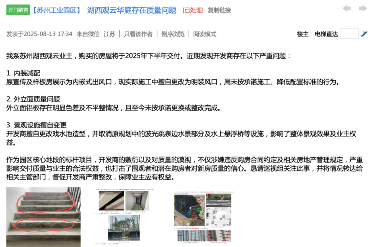 违规交付:在交付之前业主指控项目未达标即强行通知收房,整改责任被推诿至物业,另外很多业主输出各种品质问题。