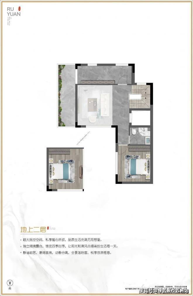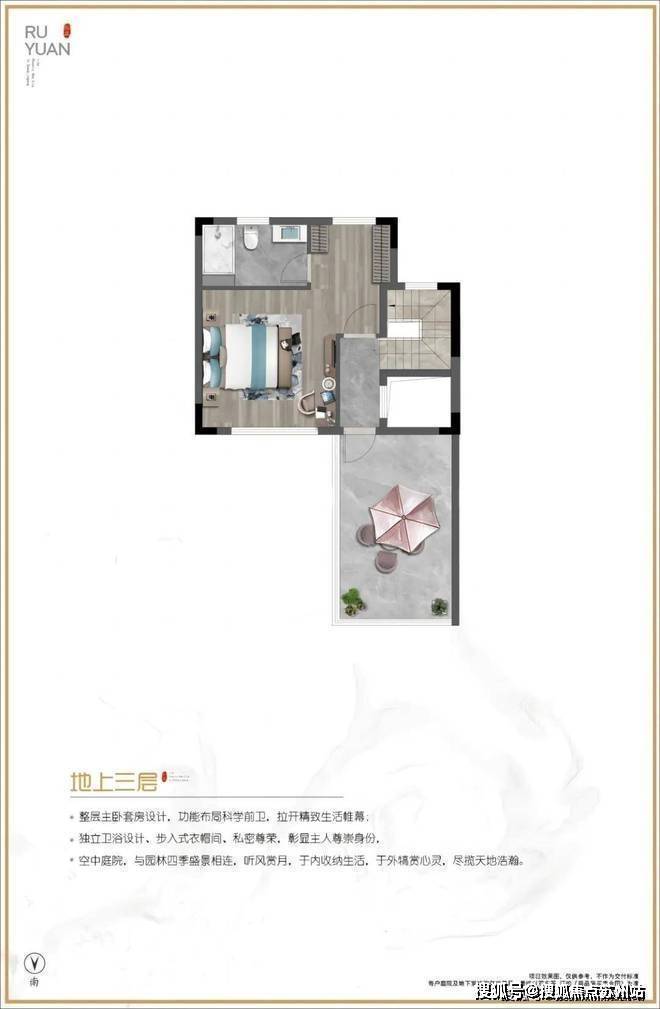 三楼整层主卧套房设计,带空中庭院。当夏天的时候约几个朋友在庭院上喝喝茶,或者约几个朋友吃吃烧烤,喝喝啤酒,让您真正感受到人生的惬意和人与自然共呼吸的美好生活。