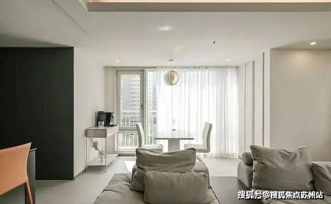 电视墙就比较简单了,大白墙耐看实用,不要电视柜后,整个空间也显得格外清爽,无主灯设计保证了室内的通透感,加上两面落地窗的采光,看着就亮堂堂的。