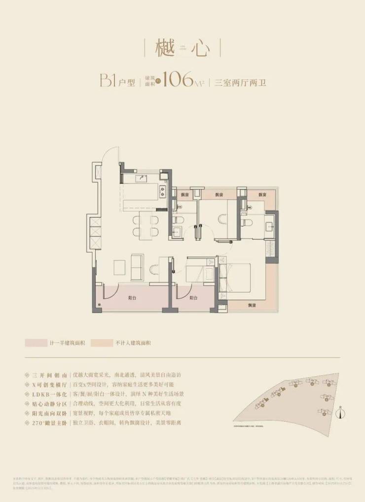 大华望樾的高层建面约94㎡户型做到了三阳台的配置;