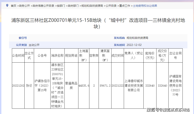 2022年12月2日,浦东新区人民ZF官网公示了浦东新区三林社区Z000701单元15-15B地块的出让结果,上海香印城市建设投资发展有限公司以总价332640万元竞得该地块,楼板价37096元/㎡,暂无联动价。