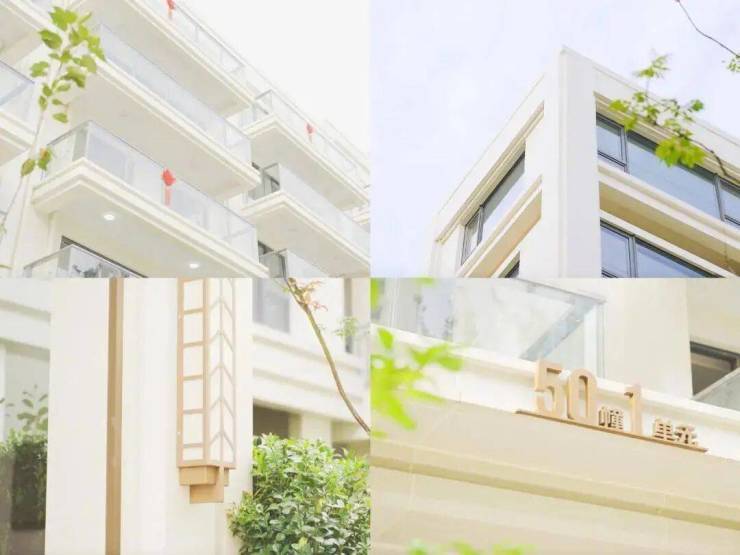 外立面1-3层石材干挂,4层以上真石漆+Low-E玻璃,米白色主调还原法式宫廷美学