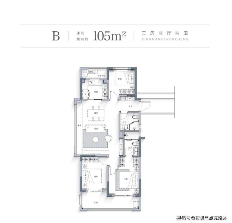 建面约105㎡带来了三房的舒适性升级,超大全景边厅+开放式厨房一体化设计,构建了大空间的动区生活核,更好地满足家庭聚会或朋友聚会对空间的要求。带步入式衣帽区的奢尺主卧套房,双开间宽景大阳台,品质感全面升级。