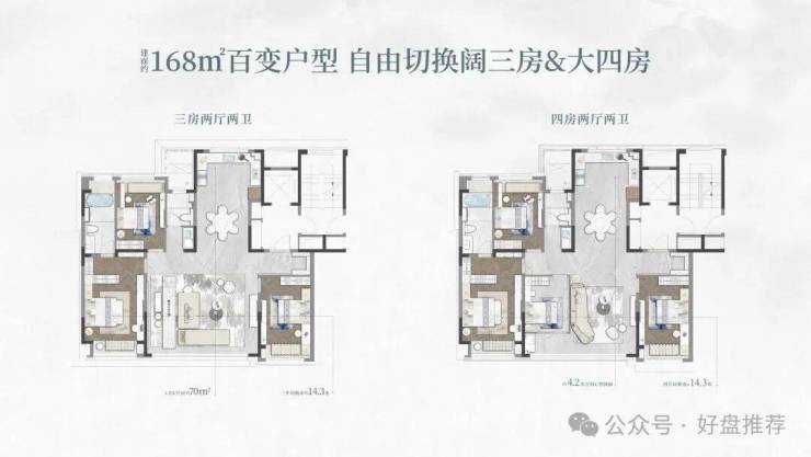 精装湖景平邸——以“灵动通透、全周期适配”为导向,建面约168㎡户型设计了2款空间方案,既可选择大三房、也可享受阔四房。“大面宽、短进深”的格局显著提升了空间的通透感与采光面,并结合部分户型的景观优化,实现推窗见湖的视觉延伸。灵活转换的“百变”空间设计,能从容应对从二人世界、三口之家到多代同堂的家庭结构变化。国际一线精装品牌与独立电梯厅的配置,则在细节中夯实了归家仪式感与日常生活的品质基底。