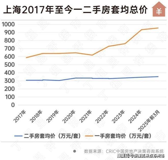 CRIC数据显示,2017年至今,上海一二手房成交套数的比值一直在1:3左右,也就是说每卖1套一手房就有3套二手房成交。从成交套数来看,二手房占据绝大多数。与此同时,虽然一手房经常出现较高成交价格,但上海二手房套均总价一直在300多万元/套,2025年一季度上海二手房套均总价为352.56万元/套。