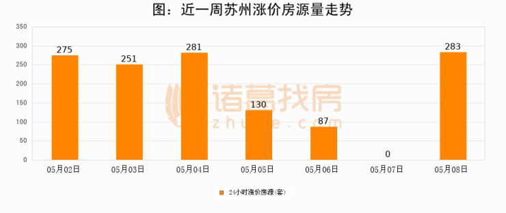 根据诸葛找房数据显示,苏州24小时涨价房源量为283套,较05月07日增加283套,环比上涨0%。与此同时,涨价房源占比小幅扩大,业主信心有所提升。