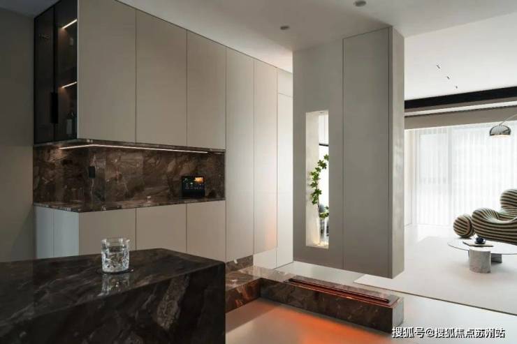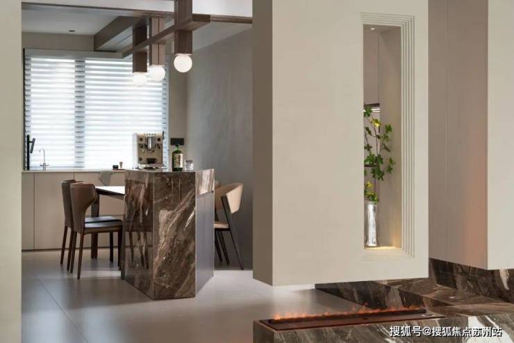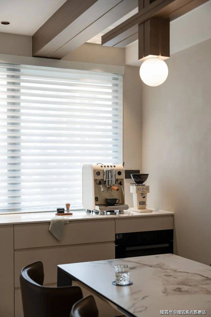 上海闵行古北壹号公馆售楼处电话☎:400-8123-664(预约看房热线)餐厅中心奢石岛台,提升用餐的美学体验,在舒适中不乏高级的质感。临窗处规划西厨料理操作台,高级感咖啡机,精工美学,写意精致生活。