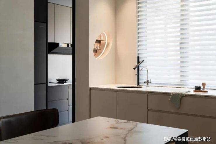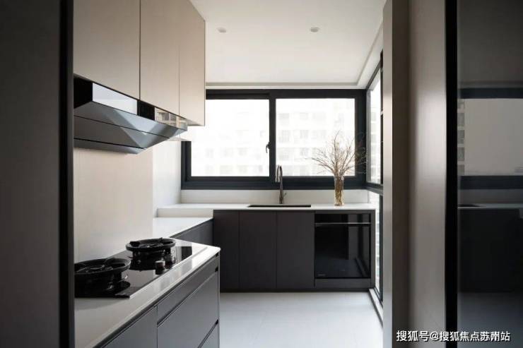 中厨房将家政阳台空间纳入内,打造宽敞愉悦的烹饪场所。整体黑白灰运色,一种高级的现代时尚,将简约与雅致完美呈现。