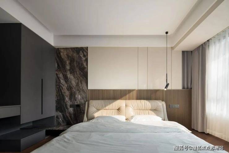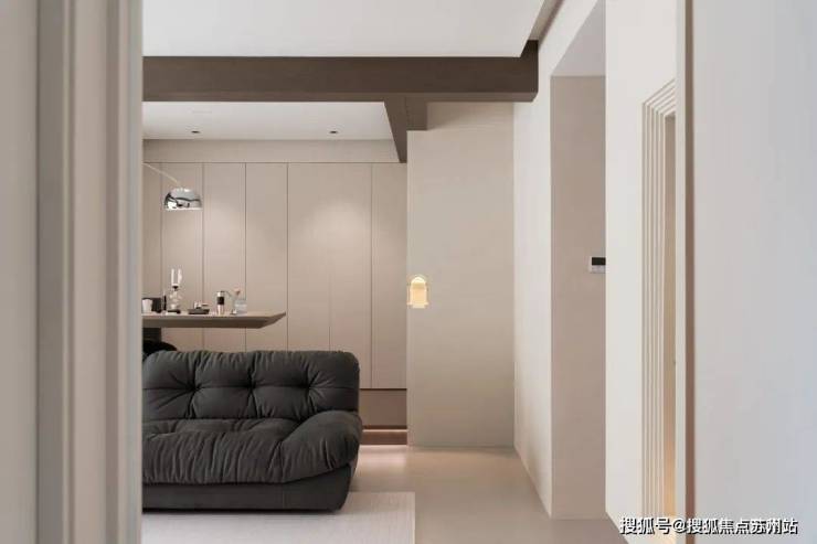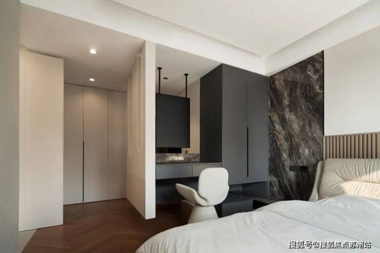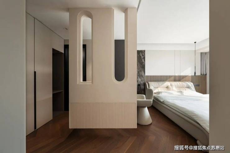 主卧室的入口移迁至客厅区域,视觉上以隐形门形式,与电视背景墙无缝对接。目之所及之处,满是温柔与惬意。