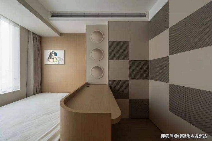 次卧采用榻榻米设计,一体式的榻榻米、书桌以及隐形式衣柜,高效利用空间。整体不乏温柔和趣味性,弧形元素的与方格色块的融合,为房间注入灵动与活力。