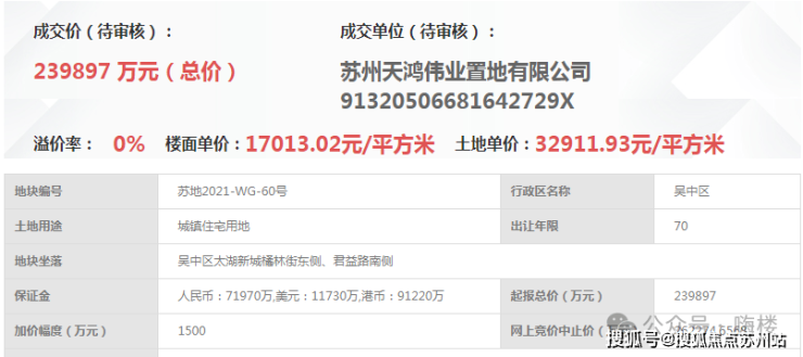 仁恒滨湖湾为苏地 2021-WG-60 号地块,于 2021 年 11 月 25 日,由天鸿伟业以底价 239897 万元竞得,成交楼面价 17013 元 /㎡,溢价率为 0%。