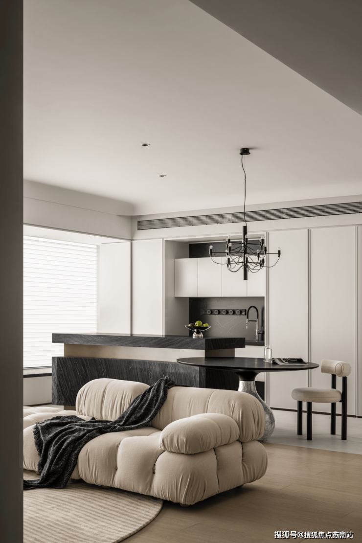 厨房、餐厅、吧台的结合十分轻盈,松弛的生活态度随处可见,厨房位于角落处,让油烟终止在角落,为其他区域带来了更多的舒适感。