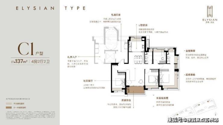 约137m²户型对于纯改善需求的量身定制。据说,保利前基于客户做了非常多的样本调研,这个户型就是一个很好的例子,将大尺度的横向面宽,大开间的U型厨房,南北通的客厅尺度也极为优秀,深度匹配了多家庭成员的社交需求。主卧套房采用了270°大转角飘窗,步入式的衣帽间设计,私密性和尺度感都很棒。