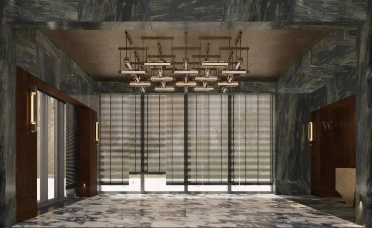 湾上采用地上+地下三层同标准精装入户大堂,大堂选用有着媲美艺术品表现力的亚马逊绿天然奢石,而且地上地下一脉相承、华贵一致,结合仿古铜不锈钢、艺术壁灯为点缀,将上海的摩登气息注入归家大堂,给业主更强烈的入户仪式感。