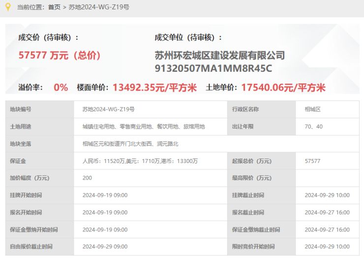 苏地2024-WG-Z19号地块,位于相城区元和街道齐门北大街西、润元路北,城镇住宅用地、零售商业用地、餐饮用地、旅馆用地,占地面积32826平,该地块在2024年9月,由苏州环宏城区建设发展有限公司竞得,成交总价57577万元,成交楼面价13492元/平,溢价率0%。咨询热线:18662309054