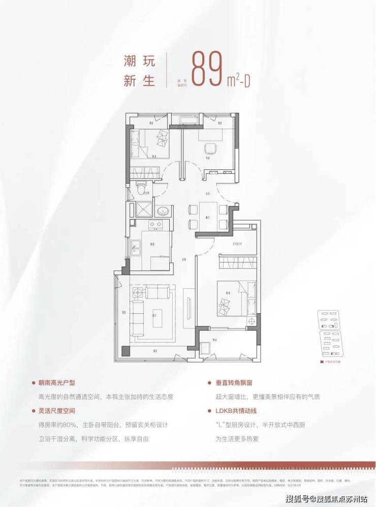 不同于一般的三房把这个小房间直接做了主卫,这个项目把选择权留给了购房者,并在下方铺设了上下水管、相当人性化!除了以上亮点之外,这个户型还有惊喜小细节。为了解决爱买买买的年轻人收纳痛点,户型设计上保留了厨房最大的收纳空间,可以打双组吊柜。在主卧和次卧都预留了收纳柜的位置。除了三开间朝南的经典户型,89m²还做了三面通风的户型。