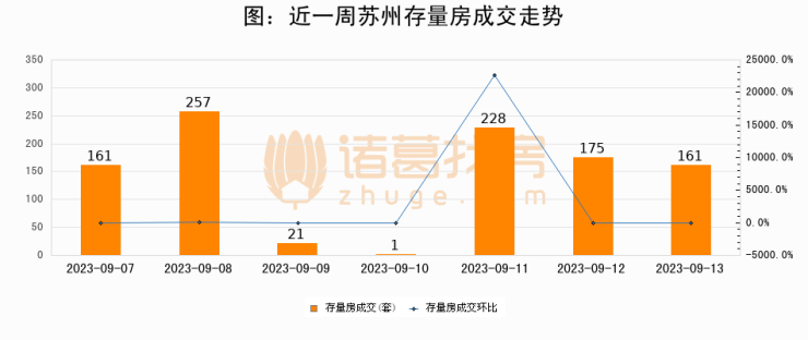 从存量房来看,2023年09月13日苏州存量房单日成交161套,比昨日减少14套,环比下降8%。从近一周存量房成交来看,苏州存量房日均成交套数为143套,09月13日单日成交161套,高于近一周平均水平12.6%。