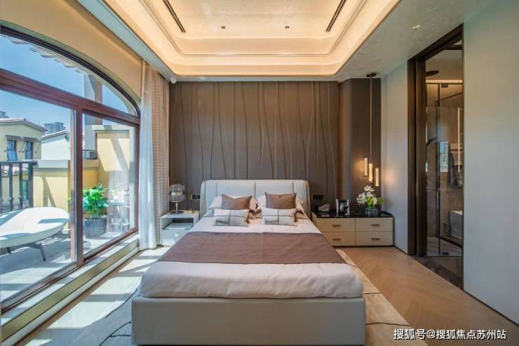 我们看到,建面约212方大户型主卧还有媲美宫殿的“穹顶式”天花板,尺度感、舒适度都让人叹为观止。