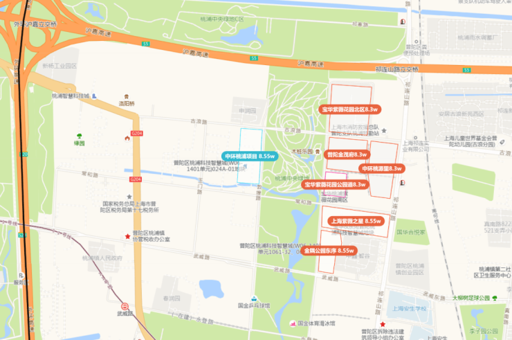 从住宅分布的版图来看,东侧的宅地基本已经出让完成,宝华紫薇花园公园里/公园道、中环桃源里、普陀金茂府等项目,依旧在续销中;
