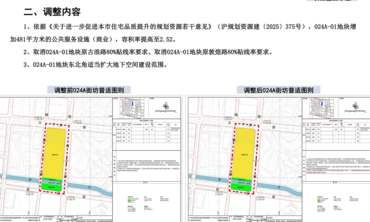 与规划设计方案同步公示的,还有街坊的规划调整;根据规划,024A-01地块内需增加481平米商业配套。
