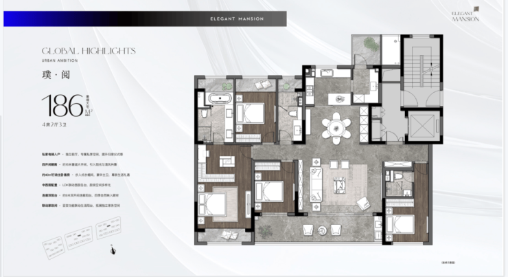 建面约186㎡:约55㎡LDK餐客厨厅一体化,联动超大阳台,私家电梯入户,配备中西双厨与独立岛台。
