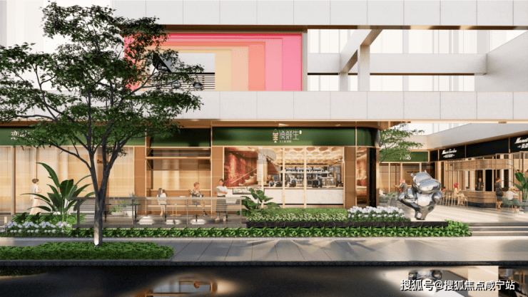 在空间上,项目让出城市街角空间形成街角绿化社区名片,约75米超长尺度城市街区生活形象,打造城市温情归家界面。同时利用项目自持的约500㎡商业配套,为业主提供家门口的休闲与便捷,也能触发更多的社交可能。