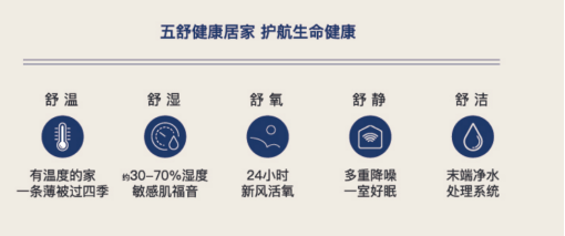 金茂引领行业的“绿色健康科技住宅”基因必将在此延续和升级.从温度、湿度、空气、水质、光照到噪音控制,一套完整的五舒十二大科技系统将是标配.