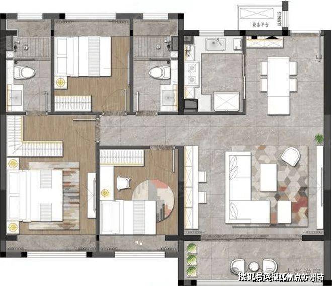 u型厨房设计,做到了四房,基本上没有空间浪费。